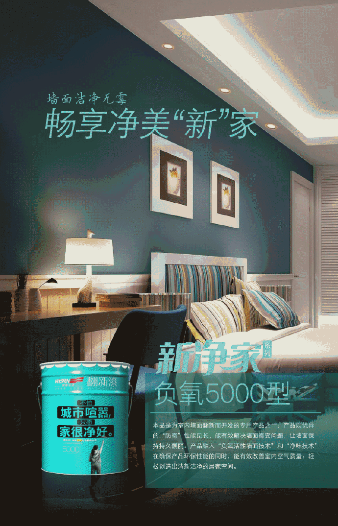 產品融入“負氧活性墻面技術”和“凈味技術”在確保產品環保性能的同時,特有的生態防霉粒子,能長時間有效抑制墻面霉菌滋生,還能有效改善室內空氣質量。輕松創造出清新潔凈的居家空間。