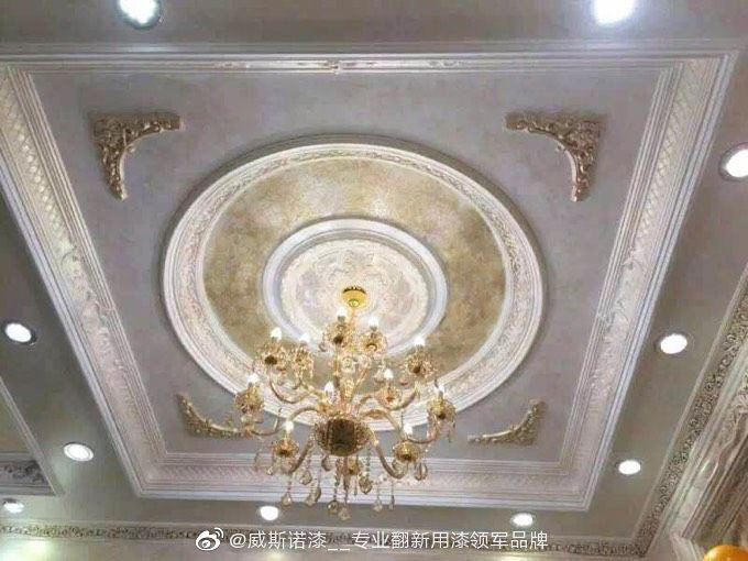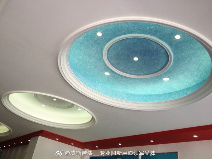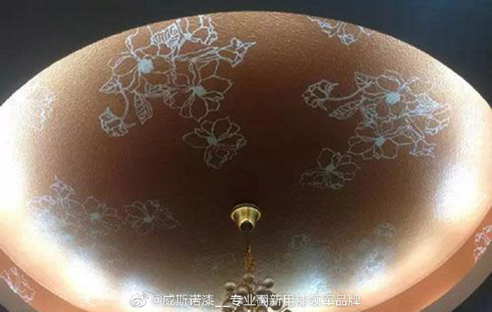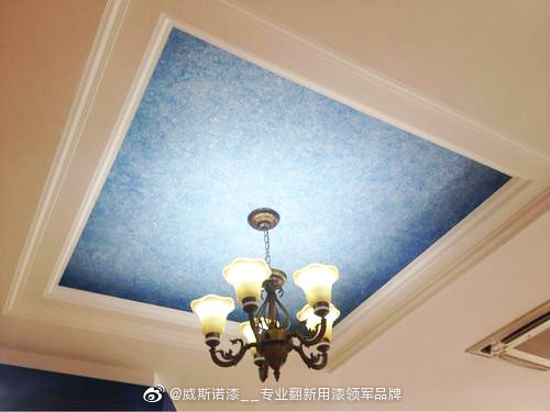 臥室天花吊頂藝術漆效果,它通過特殊的涂裝工藝、專用的模具,在上做出風格各異的紋理、質感、圖案,并擁有奇幻的折光映射效果,乳膠漆和藝術漆結合使用。